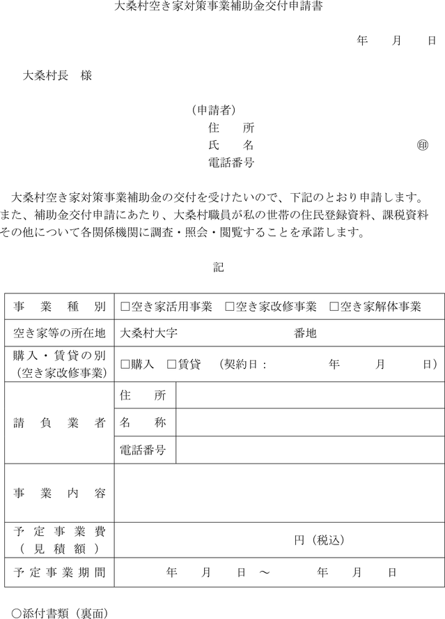 第5条 補助金の交付を受けようとする者(以下「申請者」という。)は、大桑村空き家対策事業補助金交付申請書(