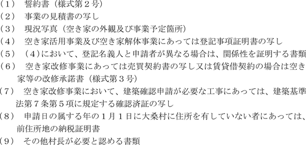 様式第1号)に次に掲げる関係書類を添付し、村長に申請しなければならない。