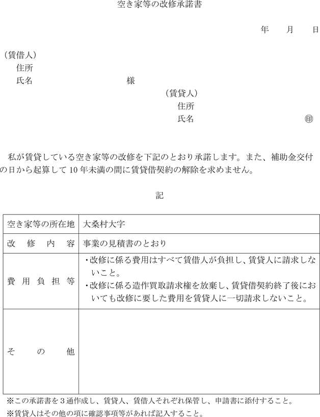(6) 空き家改修事業にあっては、売買契約書の写し又は賃貸借契約の場合は空き家等の改修承諾書(