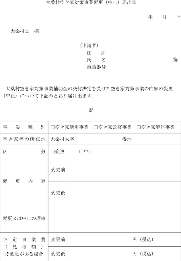 第7条 補助対象事業の内容を変更又は中止しようとする場合は、申請者は大桑村空き家対策事業変更(中止)届出書(