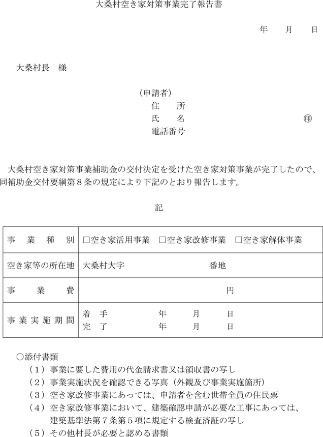 第8条 申請者は、補助対象事業が完了したときは、完了の日から1月以内(完了日が3月中にあっては3月31日まで)に大桑村空き家対策事業完了報告書(