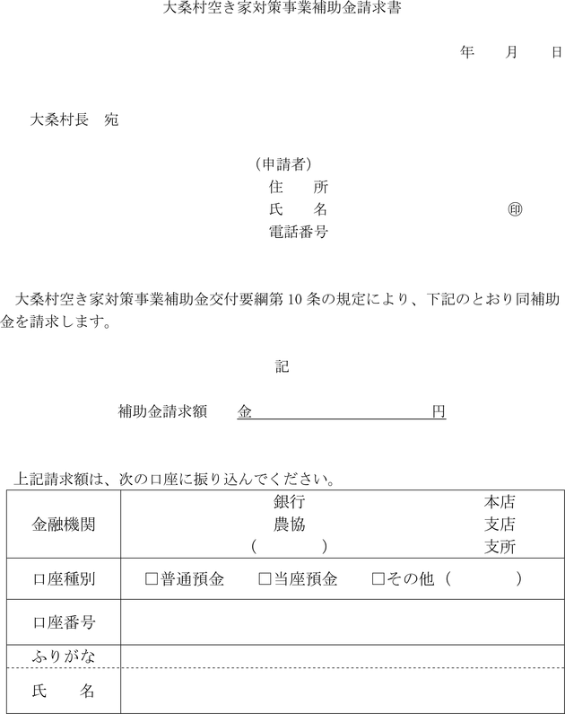 第10条 村長は、前条の通知後、申請者が提出する大桑村空き家対策事業補助金請求書(