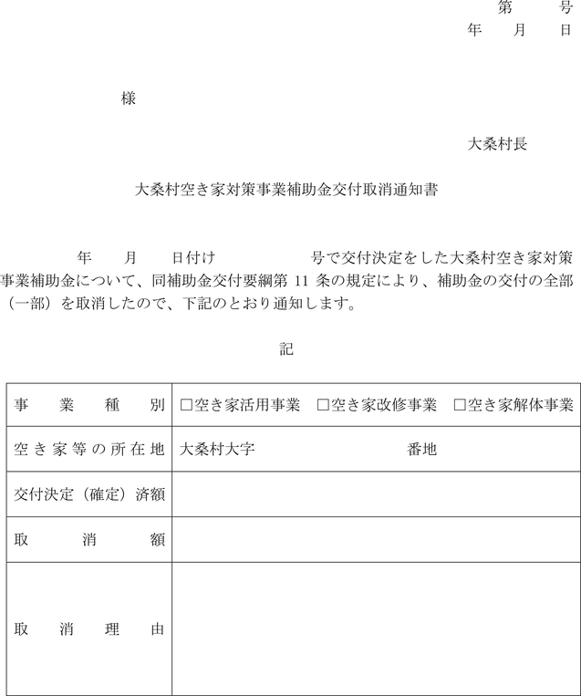 2 村長は、前項の規定により補助金の交付の全部又は一部を取り消したときは、申請者に大桑村空き家対策事業補助金交付取消通知書(