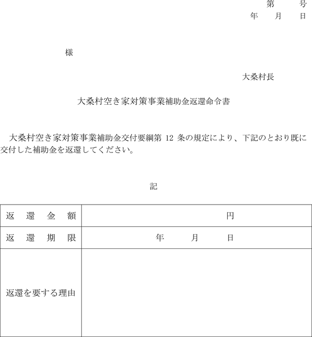 第12条 村長は、補助金の交付を受けた申請者が次の各号のいずれかに該当したときは、大桑村空き家対策事業補助金返還命令書(
